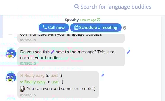 Second, the message system comes with a color-coded correction system, which allows you to correct your partner’s mistakes (see below). This seriously aids in remembering the errors as well as how to correct them. Aside from text chat, Speaky supports voice calls as well.